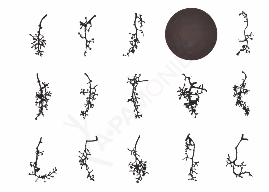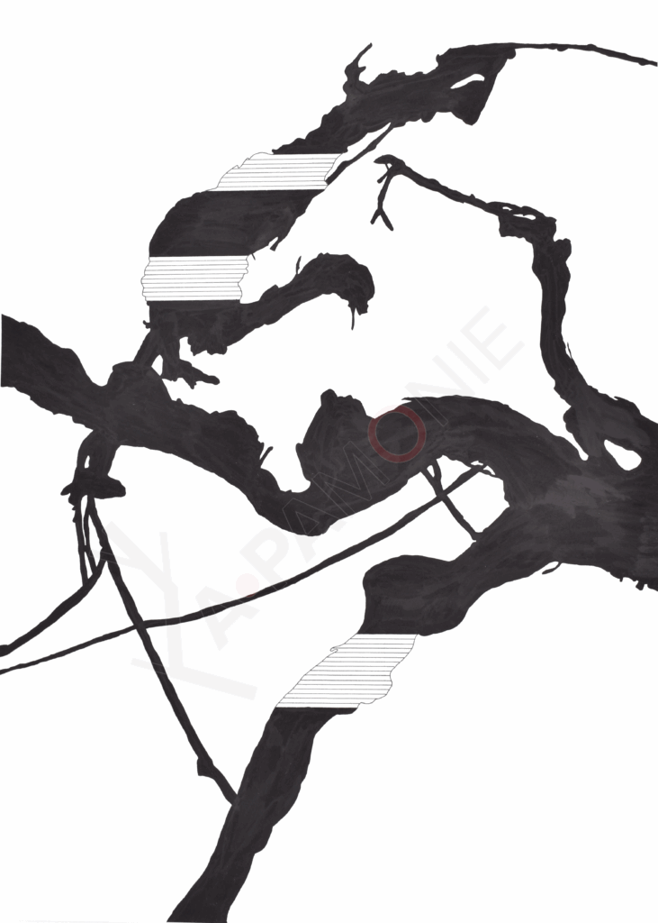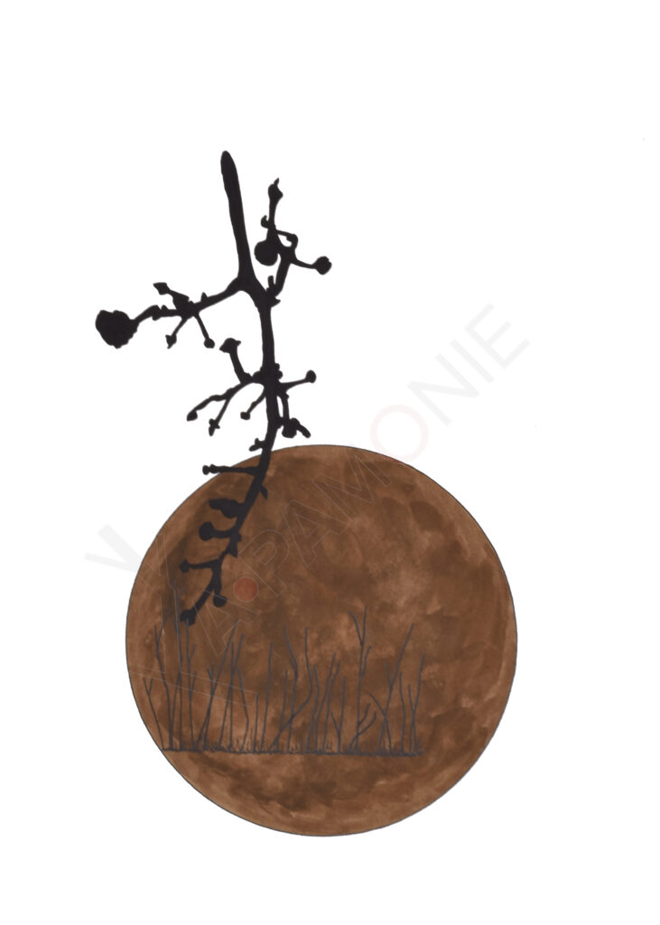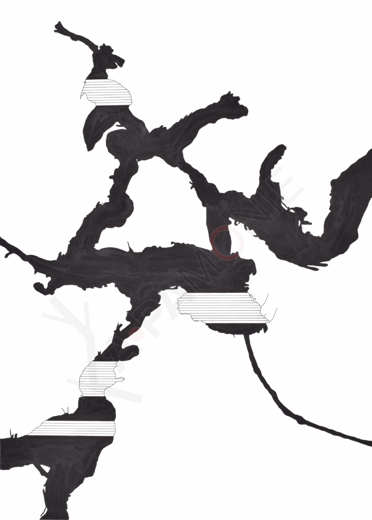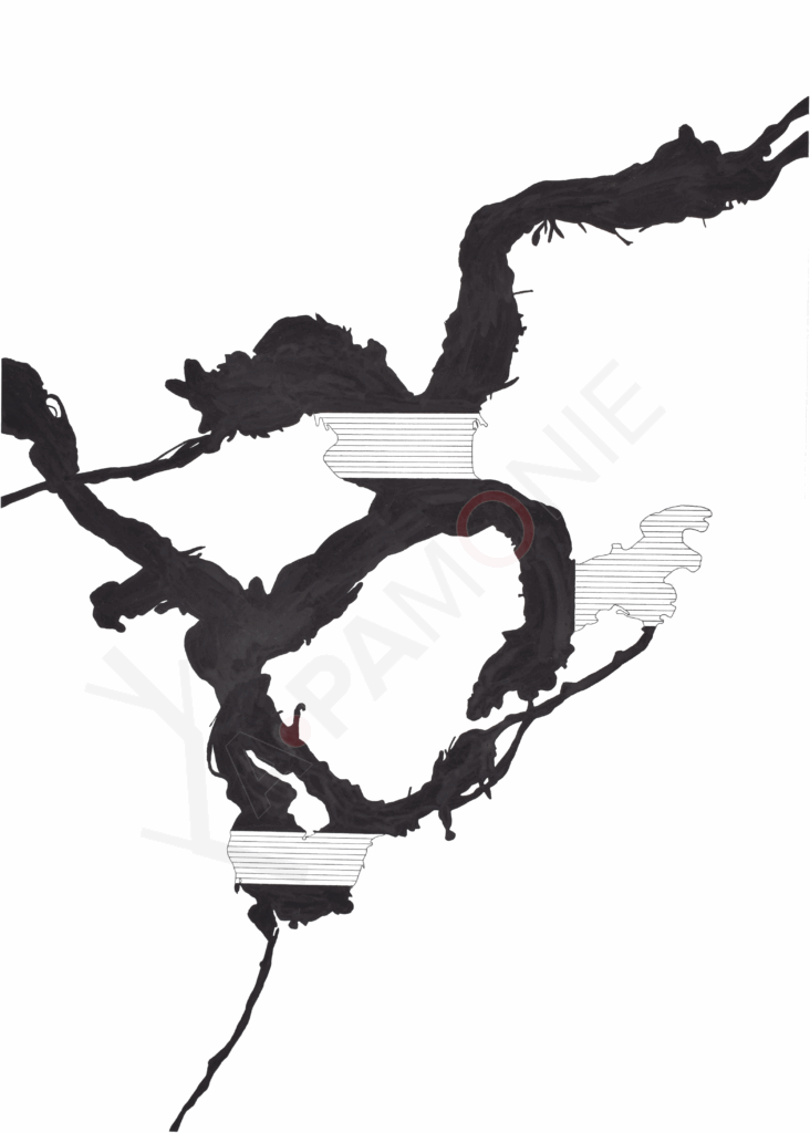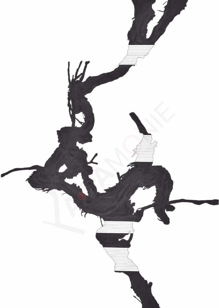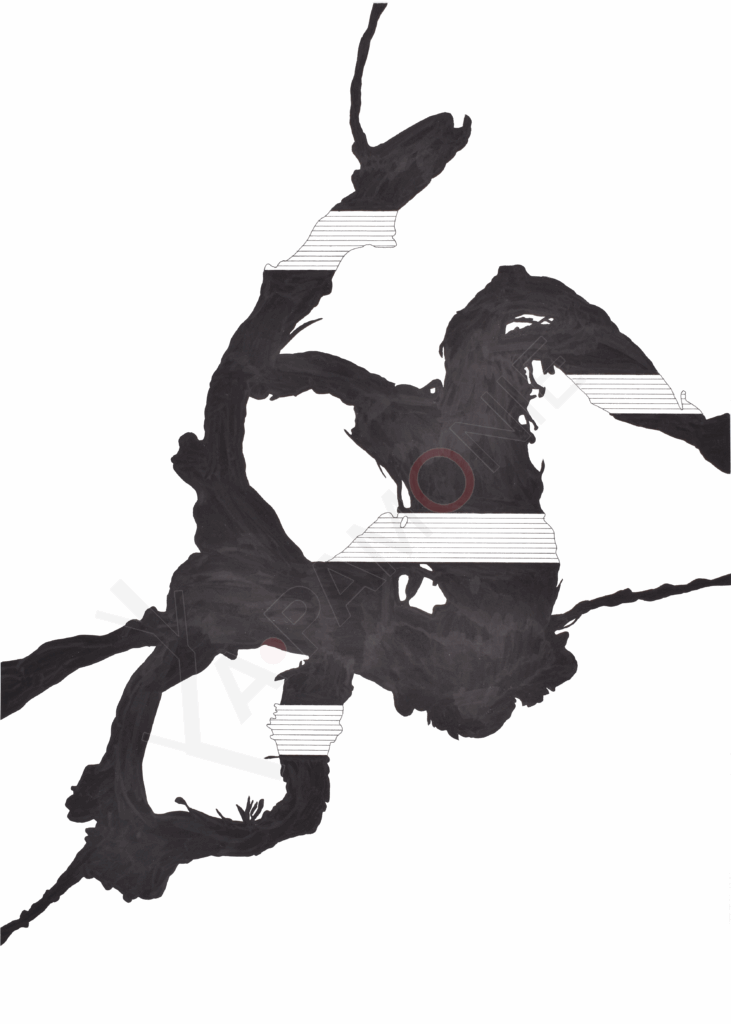 Cette sculpture a été créée à partir d’un cep issu des vignobles du domaine Mérieau. Il s’agit d’un prolongement en trois dimensions de la série des réseaux. L’aquarelle qui en constitue le fond transpose la silhouette du cep. Toutefois, l’ombre du plant arraché vient compléter celle théorique placée sur la feuille de papier, ceci de manière variable en fonction de l’éclairage ambiant.