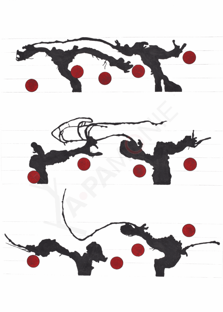 Tortueux, impressionnants et prenant des formes incroyables, les pieds de vignes sont ici assemblés pour créer des réseaux où motifs organiques et géométriques, d’échelles différentes, s’entremêlent. Il se forme ainsi des combinaisons qui surlignent les contrastes dans le paysage viticole, végétal et donc relativement sauvage, morcellé de parcelles aménagées et linéaires.