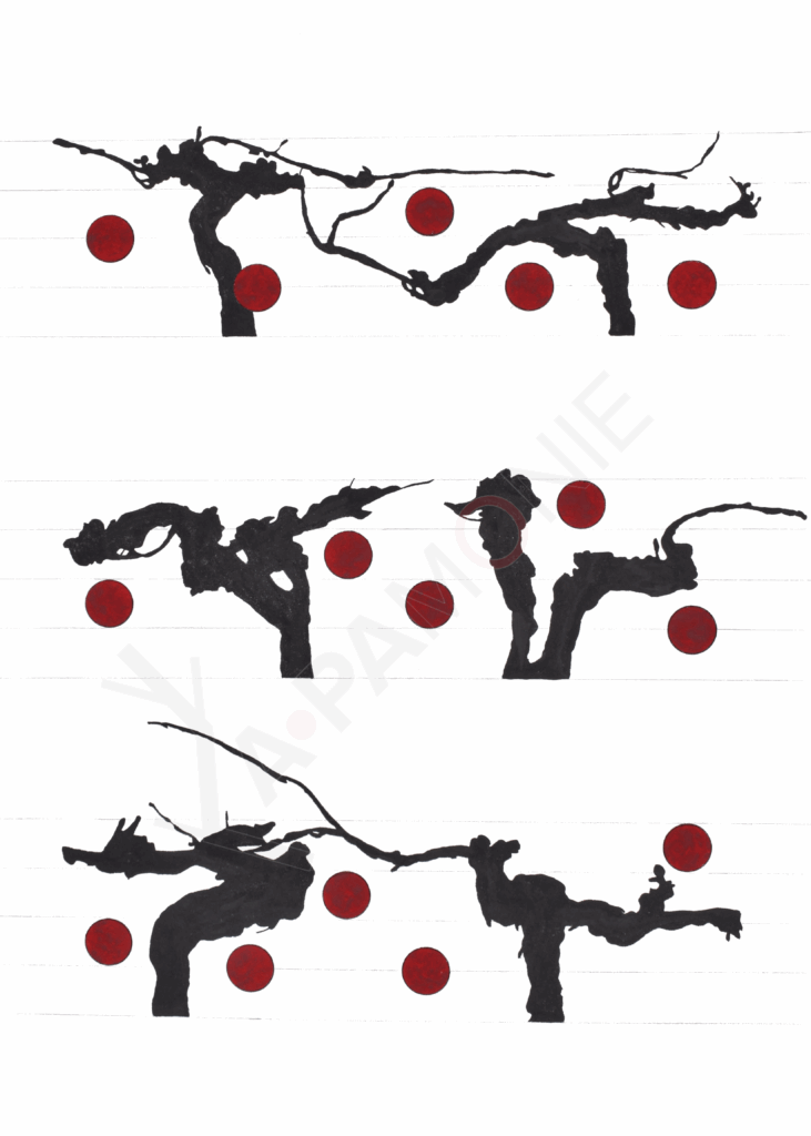 Les fils de palissage qui guident les tiges des plants de vignes évoquent les lignes d’une partition. Les silhouettes des vieux ceps y sont des clefs accompagnées de notes dont la couleur, rouge, rappelle celle des robes des vins (grenat, rubis…) et des arômes de fruits qu’on y trouve (baies et fruits rouges, cassis…)