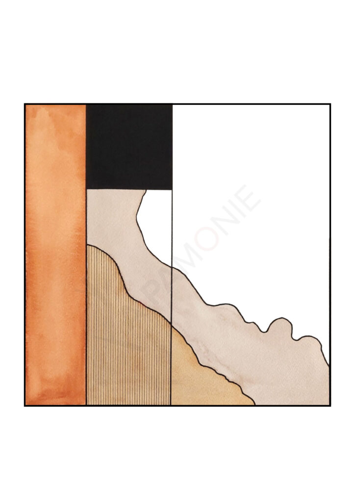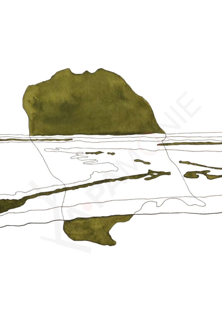 A l’Île Madame, l’estran est marqué par de nombreuses strates qui forment des niveaux et des reliefs qui dessinent des paysages horizontaux. Cette série les restitue de manière minimaliste, superposées à la silhouette de l’Île Madame, en référence à la structure naturelle à laquelle elles appartiennent.